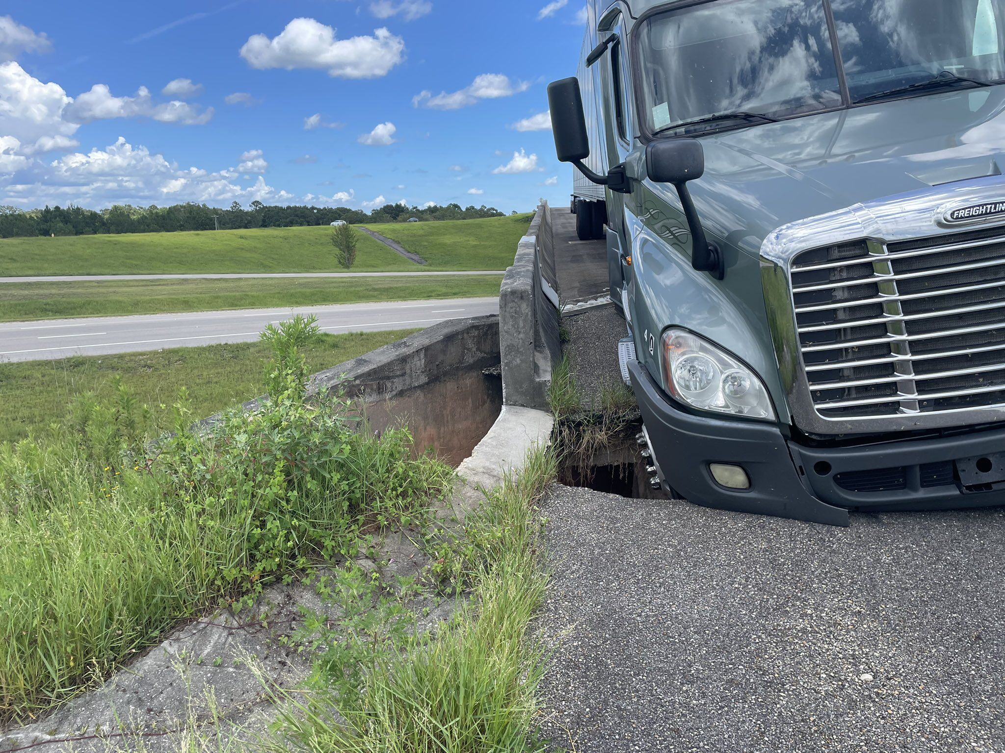 Mississippi Highway Patrol responded to a report of a road collapse under a semi truck on July 27, 2022 in Harrison County at Highway 67 & US 49. The off-ramp to US 49S at Highway 67 is closed for repairs.